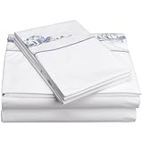 Gorgeous embroidery and the soothing combination of sky blue and white make these sheets a must have for the bedroom. Expertly woven in Portugal of 220-thread-count cotton percale, the California king set includes one 100-by-118-inch flat sheet, one 72-by-84-inch fitted sheet and two 21-by-41-inch king pillowcases. The set is in solid white, and the flat sheet and pillowcases are each adorned with 6-inch white top cuffs set off with a row of blue stitching. A beautiful, sophisticated blue scroll pattern embroidered on the corner adds decorative depth. The sheets are durable and easy to care for at home in the washer and dryer. The fitted sheet is designed with elastic all around for a snug grip and will fit deep, luxury mattresses up to 16 inches thick. Made to coordinate with the Pinzon Provence Bedding Collection, the sheets will also confidently stand on their own to enhance most any bedding and decor.