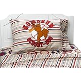Send your little one to dreams of adventure and baseball action with this complete sheet set for Twin beds from the Scooby Doo Baseball kids' bedding collection. It includes one fitted sheet, one flat sheet, and one standard-sized pillowcase. The flat sheet has a multicolored pinstripe design that's accented by a red baseball-stitched hem. The fitted sheet has an all-over baseball-themed patch design on a white base. The pillowcase continues the flat sheet's multistripe, and adds an illustration of Homerun Scooby Doo. The fitted sheet will fit mattresses up to 12 inches thick. They're made from 50 percent cotton, 50 percent polyester with a 150-thread-count. Machine wash and dry for easy care. Made in China.