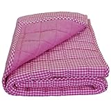 (More customer reviews)As pictured/described. Gingham cotton material quite soft, solid color opposite side just a shade less soft but still cottony material.Batting makes it subtly fluffy. Feels better than expected from picture. Great blanket!