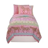 What little girl doesn't dream of ponies? You can make her decorating dreams come true with this fanciful Cow Girl complete bedroom ensemble. As a special bonus, the decorative elements are completely reversible-this unique Flip It construction creates two complete bedroom ensembles from one set! On one side, the comforter features stylized images of horses in horizontal band on a stippled pink background, alternating with horizontal bands of stars, horseshoes and calico flowers in shades of petal pink, magenta, sage green and turquoise. The reverse of the comforter creates a totally different look, featuring an allover combination of plaid boxes in the same pastel hues. One side of the standard flanged pillow sham features a central image of a horse on a stippled pink background, accented by a calico border. The flip side of the sham features the pastel plaid design, accented by a solid pink border. The coordinating, 180-thread-count, pure 100% cotton sheets and pillowcase feature an allover textured print with a watercolor effect in pink and magenta. The comforter and sham are constructed of a cotton-rich blend of 60% cotton and 40% polyester. All components are machine washable. The Cow Girl complete bedroom ensemble retails for $89.99 in better specialty chains and upscale catalogs!