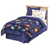 Exploration never looked better than with this fun and graphic Outer Space complete bedroom ensemble! The comforter face features an allover design of photorealistic planets and space probes on a star-strewn midnight blue ground, accented by a wide decorative band featuring planets, satellites and the space shuttle; the comforter reverse, flanged pillow sham and bed skirt all feature the allover star design. The 180-thread-count percale sheets and pillowcase feature smaller-scale images of planets and space probes on a crisp white ground, accented with a narrow band of the star design. All components are constructed of a cotton-rich blend of 60% cotton and 40% polyester, and are machine washable.