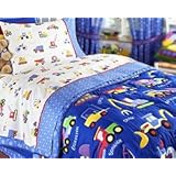100% soft cotton sheets are covered with dump trucks, cement trucks, rollers and more against a non-bleached white background. The flat sheet and the pillowcase have a coordinating blue with darker blue circles as the hem that is folded and sewn, then bordered with a fanciful bright red attached ribbon trim. The twin comforter measures 68 in x 86 in. 100% Cotton. 180 Thread Count. Twin sheet set is 100% ultra soft Percale Cotton, 210 thread count. Set includes: 1 fitted sheet, 1 flat sheet and 1 pillowcase. Flat sheet: 66 in. x 96 in., finished. Fitted sheet: 39 in. x 75 in. Pocket depth: 11in. Pillowcase: 30 in. x 20 in.